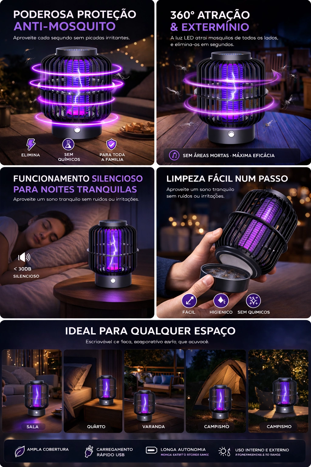 Concebido para a vida moderna, este inseticida é eficiente em termos energéticos, portátil e fácil de utilizar. Com carregamento USB e design leve, pode levá-lo para qualquer lugar — de casa ao campismo. A limpeza é rápida e fácil graças ao recipiente de recolha amovível. Seja em ambientes interiores ou exteriores, adapta-se perfeitamente às suas necessidades e oferece uma proteção fiável em qualquer lugar.